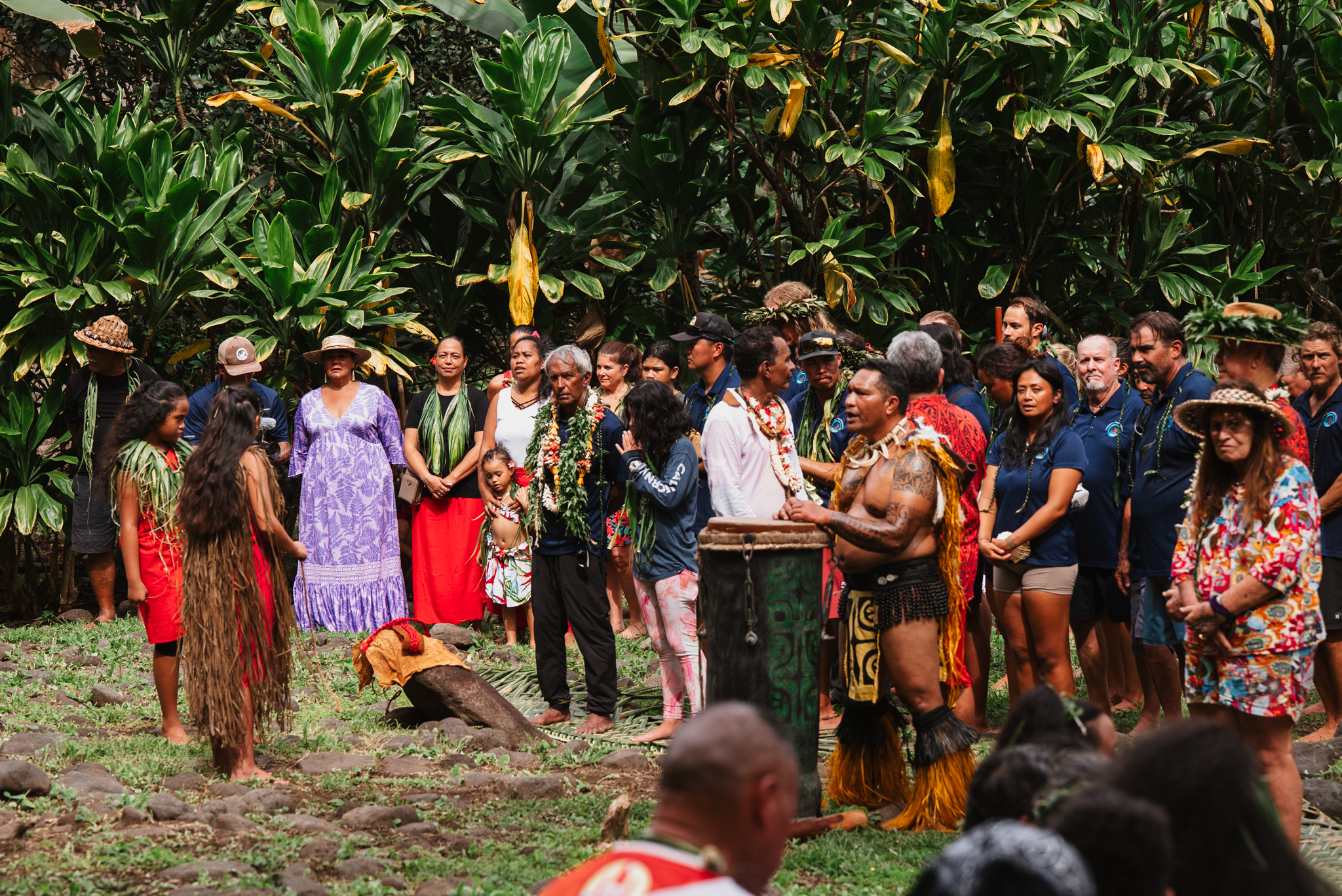 As the scene continued to unfold, someone from Tahiti said, “You need to introduce yourselves. Introduce yourselves!” Jonah then, in simple Hawaiian, introduced himself and where we are from. Maleko also introduced that Nainoa is a Paoa. It was the key we needed to unlock the true welcome to this special place. The kupuna wahine leading the ceremony stepped forward and her face softened, her eyebrows peaked, and she said “Ahhh Paoa! Mai. Mai.” We were now allowed to enter. The tension in my body, and the fear in my heart left. I was still uneasy, and felt some worry that we were not properly prepared for what was going to happen and what we had to do, but one at a time we walked forward, taking off our shoes and washing our feet with wai before entering the marae. At the top of the sloped marae was a kupuna kane with tattooed legs and large feathered headdress, and another male on a pahu; until this point, the males were not directly involved in the ceremony. There was a Paoa stone they positioned Nainoa and Puana in front of, the rest of us behind. Two small girls, about nine years of age came forward to do a short welcome in Tahitian, then three women shared with us their genealogy. Songs were shared and chants filled the canopy around us. A butterfly fluttered around near us and Nainoa felt it was his grandmother.