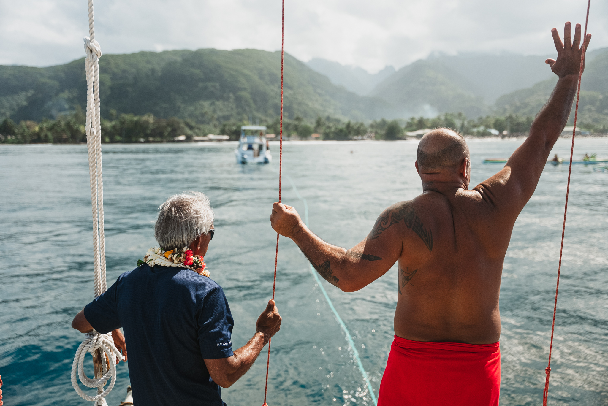 The crews of Hōkūle’a and Hikianalia had already participated in a welcome ceremony at the marae, “Ivirau To’omaru” on our way to Fare Hape in Papeno’o Valley. Many have also experienced welcoming ceremonies in Hawai’i, and a few of us have experienced powhiri in Aotearoa. We thought we were prepared for this, another Polynesian welcoming, but we were fully unprepared for the type of welcoming ceremony we were about to experience. The first hō’ailona that this would be different, was the welcome into ‘Aifa pass marked by a strange and powerful cloud formation in the shape of nine cresting waves. As we waited for Nainoa and PVS navigator Lehua to motor to us, a police boat came buzzing out with a local Tahitian priest aboard who began yelling at us, not with a warm “haere mai,” but a demanding yell – all we understood in the Tahitian he roared was “Where is Nainoa? Where is Nainoa?” We began to feel that we would not be welcome to enter the pass without Nainoa on board. Kaleohano handled the traditional oratory duel with composure and explained that we are the crews of Hōkūle’a and Hikianalia and that Nainoa was coming. We were relieved when Nainoa was spotted on his way and safely made it on board with his daughter, Puana, and Lehua.