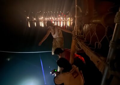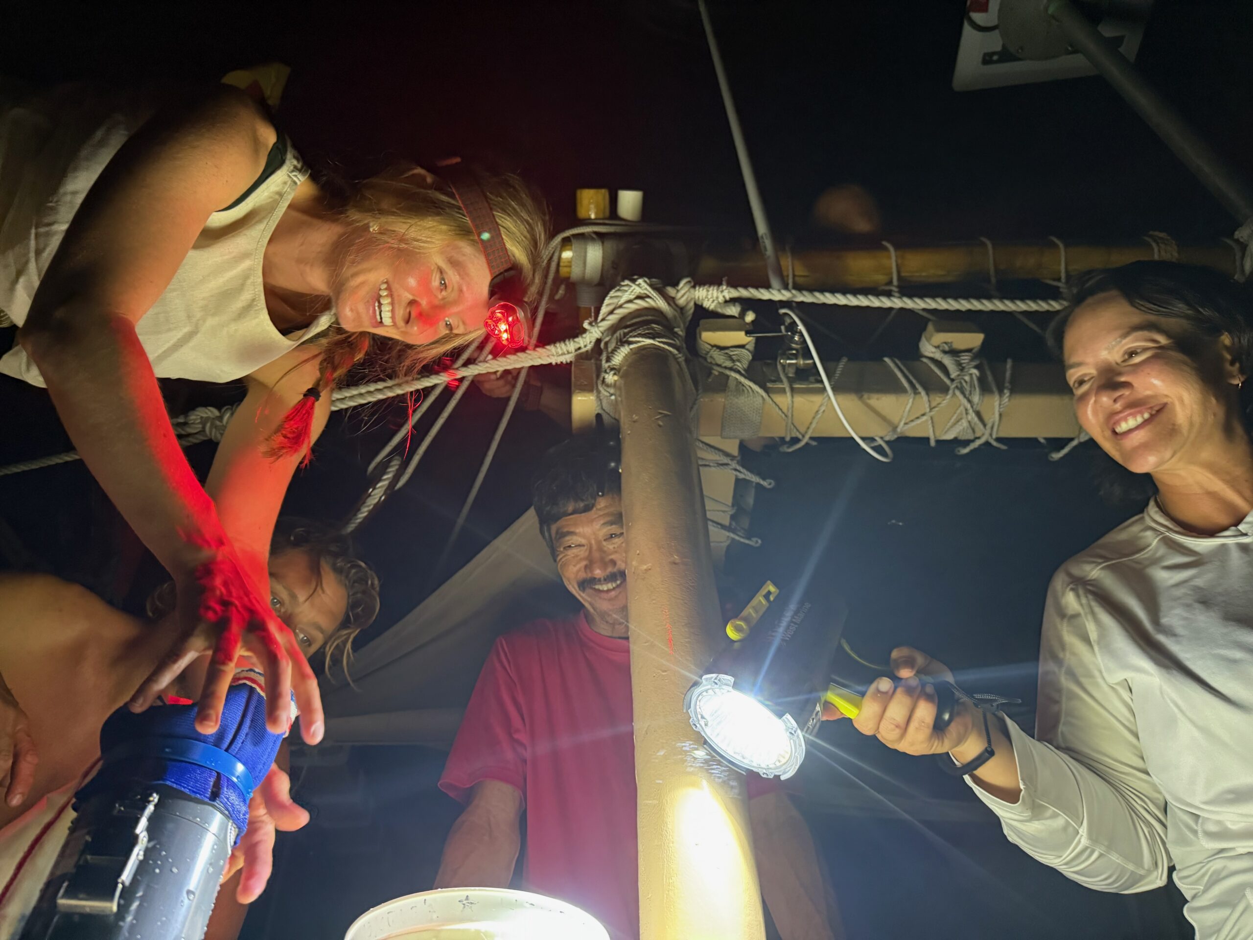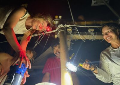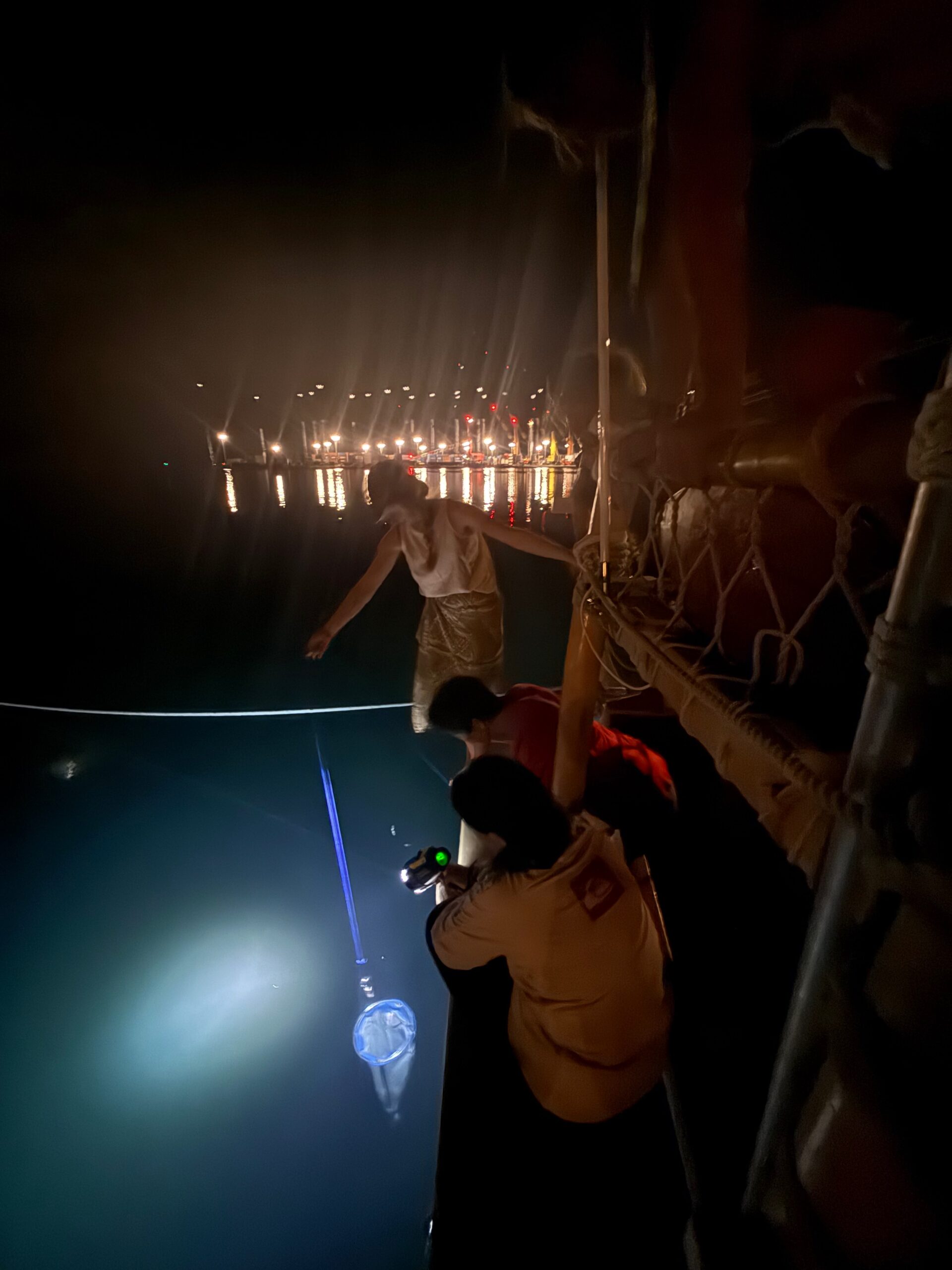Reflection: One special night, before a morning education event with students, Pua, a few other eager Hoku and Hiki crew members, and I collected plankton under the stars. Pua held a bright light over the water while we waited for zooplankton to migrate toward the surface, a behavior that helps them reach food-rich areas at night (this behavior is called diel vertical migration, or DVM). When we saw specks of life gathering in the light, we used a plankton net to scoop the water and collect them. It was a fun and meaningful way to demonstrate DVM, and to gather live specimens to use as visual aids for the next day’s event. My favorite part of the evening was witnessing the curiosity and enthusiasm of the other crew members as they helped with sampling.